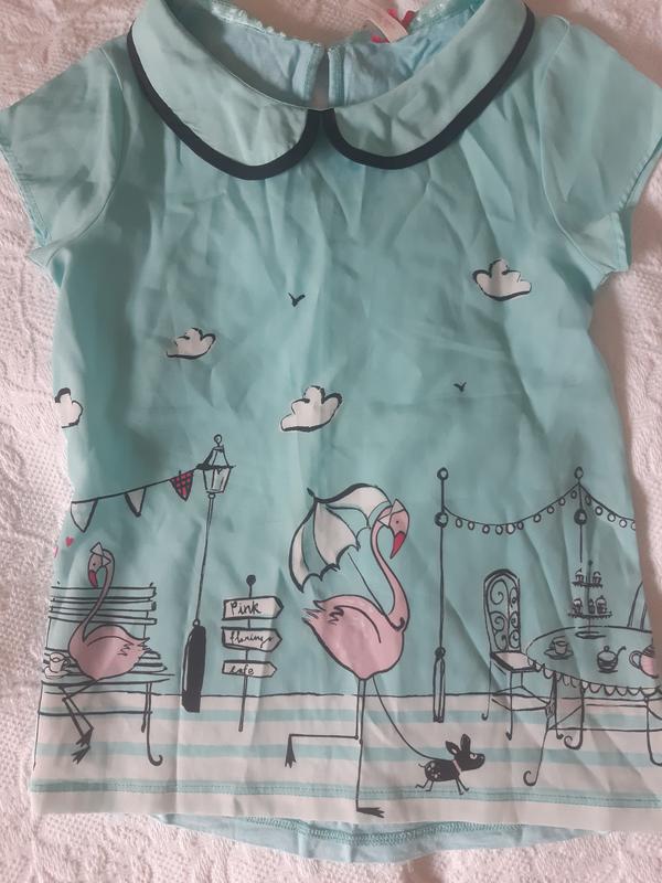 Очень стильная блуза для девочки 7 лет. Красивый цвет и оригинальный рисунок. Спереди полиэстер, сзади - вискоза Next. Ефектна!
