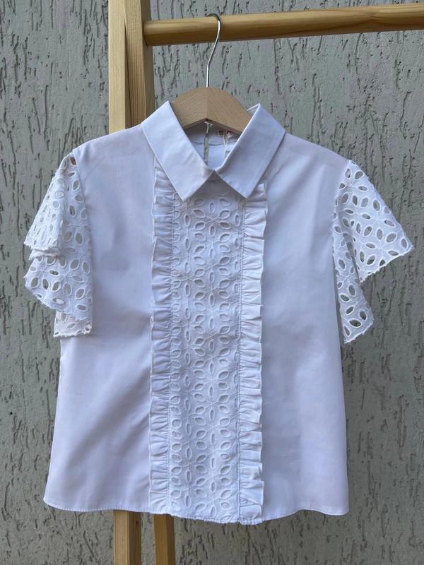 Блуза для девушек. Рубашечный стрейч поплин - 97% бавовна - 3 % еластан 🧶Прошва ( 100 % Котон) ✔️Крой полуприлегающего силуэта ✔️Рукав- крылышко и вставка на полочке выполнены из прошвы ✔️Горловина - стойка с отложным воротником ✔️Центральная застежка на две пуговицы у горловины на спинке ✔️Размеры полномерные 🎨цвет: белый Качество бомбезнение! Цена: 540грн. Замеры: 122 длина - 40см, полуобхват груди - 33см. 128 длина - 42см, полуобхват груди - 34см. 134 длина - 44см, полуобхват груди - 36см. 140 длина - 46см, полуобхват груди - 37см. 146 длина - 47см, полуобхват груди - 39см. 146 длина - 50см, полуобхват груди - 40см. Размеры в наличии: 122-1шт 128-1шт 134-1шт 140-1шт 146-1шт 152-1шт