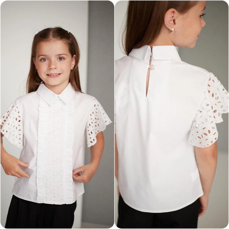 Блуза для девушек. Рубашечный стрейч поплин - 97% бавовна - 3 % еластан 🧶Прошва ( 100 % Котон) ✔️Крой полуприлегающего силуэта ✔️Рукав- крылышко и вставка на полочке выполнены из прошвы ✔️Горловина - стойка с отложным воротником ✔️Центральная застежка на две пуговицы у горловины на спинке ✔️Размеры полномерные 🎨цвет: белый Качество бомбезнение! Замеры: 122 длина - 40см, полуобхват груди - 33см. 128 длина - 42см, полуобхват груди - 34см. 134 длина - 44см, полуобхват груди - 36см. 140 длина - 46см, полуобхват груди - 37см. 146 длина - 47см, полуобхват груди - 39см. 146 длина - 50см, полуобхват груди - 40см. Размеры в наличии: 122-1шт 128-1шт 134-1шт 140-1шт 146-1шт 152-1шт