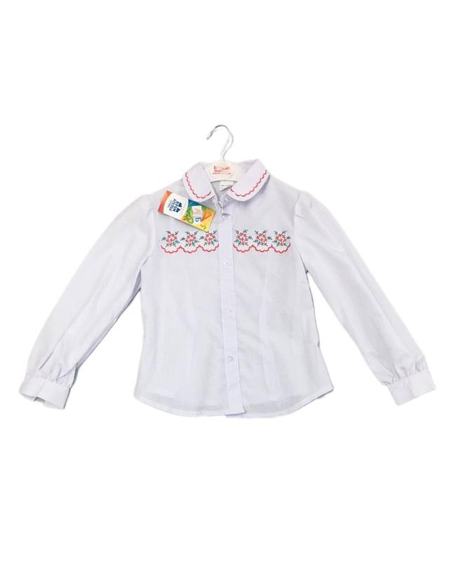 Блуза длинный рукав для девочки белого цвета, украшена с вышитым воротом.Перод блузы украшен принтом из цветов.