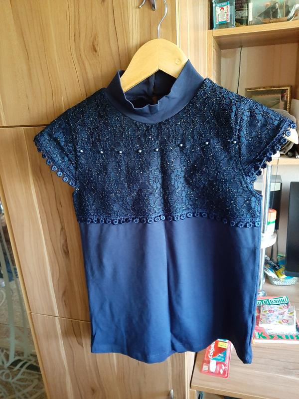 продам новую школьную блузу без бирки на рост 164 см, возможно и меньше. Цвет темно синий, с не светит кружевом, так как есть подклад, застежка на 2 пуговицы. Производство Турция.