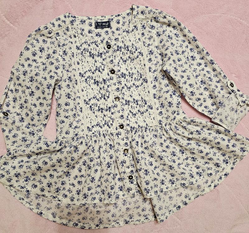Неймовірно красива блузка. Від пояса іде рюшка (дуже гарно виглядає). Перед трішки коротший. Рукавчик регулюється ґудзиком ( закочується). Спереді є мережка. На спинці - теж. Усе вказано на фото. Красиві квіточки. Довжина - спереді 36, ззаді - 50. Довжина рукава від плеча - 43, ширина у плечах -25, ширина у грудях -34.