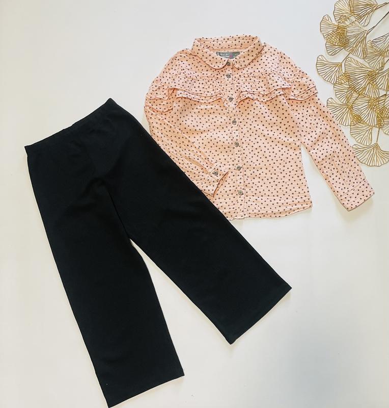 Муслінова блуза на 8 років Довжина 47 Ог 35 Рукав 45 🔷Стан: ідеальний ⚫️Штани кюлоти, тонка легенька тканина, на 7-8 років Довжина 70 Пояс 27 🔷Стан: дуже хороший 💶Ціна за комплект: 350 грн