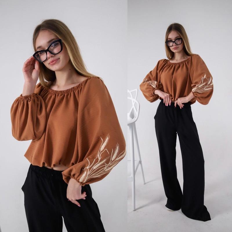 Таня арт 4427 Супер популярна вишивка колоски на трендовій блузі з американського крепу Супер якість ПОВНОМІРНІ Зріст/довж. посередині/пог/рукав похибка+-2см 140-146/31/42/41-1шт 152-158/35/46/47-1шт 158-164/36/46/50-1шт 164-170/39/48/52-1шт