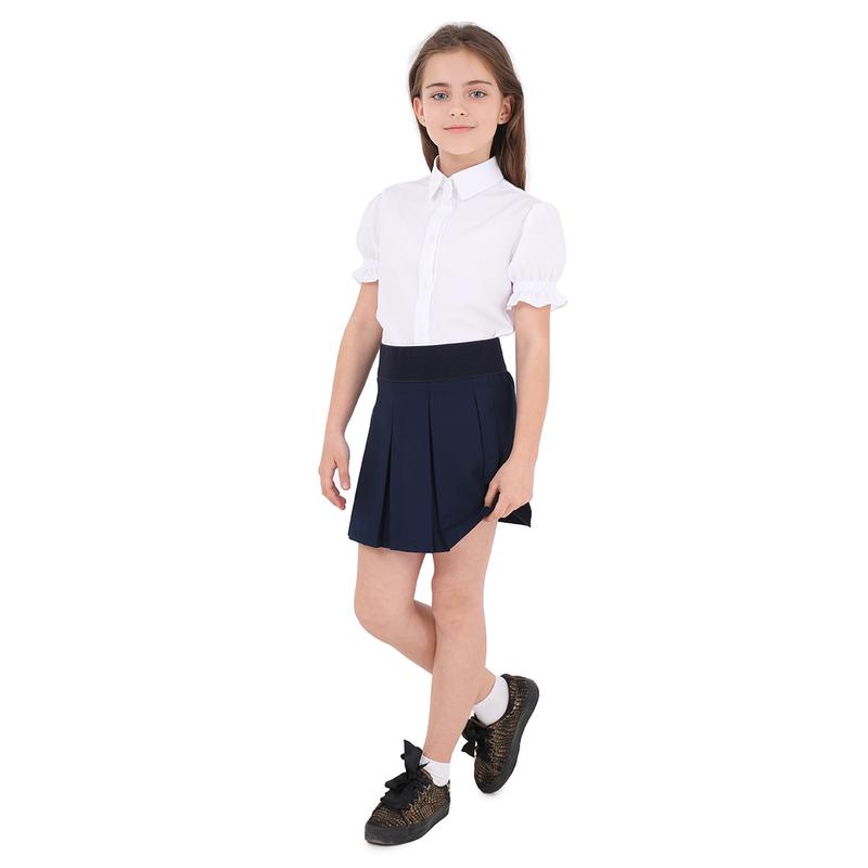 Неможливо уявити образ сучасної школярки баз легкої білої блузи, яка, безперечно, стане невід'ємним атрибутом ділового стилю юної леді. Модель з коротким рукавом фанариком, що фіксується на резинці, застібається на гудзики в тон виробу та ідеально підійде для будь-якої фігури. Виріб можна поєднувати із сукнею чи сарафаном, заправляти у спідницю чи штани. Блуза виготовлена з тканини, яка є поєднанням віскози, бавовни та еластану і має дихаючі зносостійкі властивості. Склад: 70% віскоза, 10% бавовна, 20% еластан