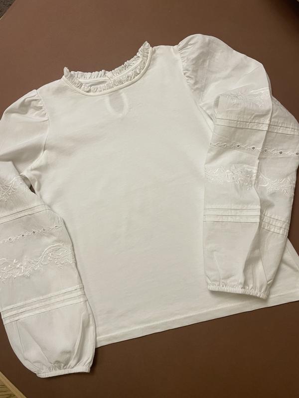 Брендовая, нежная, перед- зад- трикотаж, тянется. Рукава- хлопок с вышивкой👌🏻бирка отсутствует. Нюансов нет.