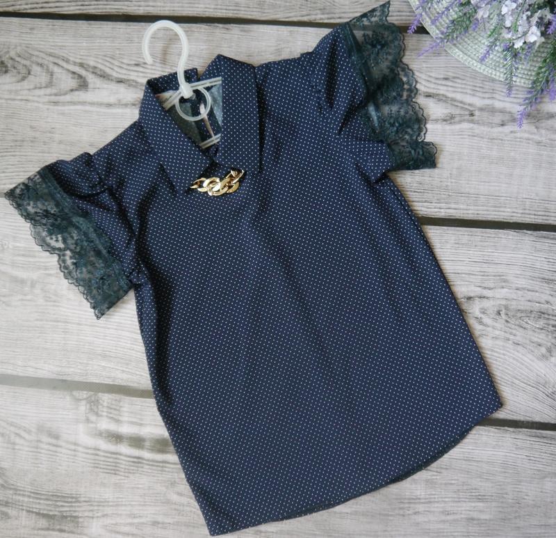 Очень красивая блузочка с цепочкой. На рукавчиках гипюр. Сзади застегивается на пуговичку. Ткань - софт. Цвет - темно-синий в мелкий горошек. Производитель - Украина. РЕКОМЕНДУЮ! Замеры: 116 - длина - 45см, полуобхват груди - 34см. 140 - длина - 49см, полуобхват груди - 38см. Мс