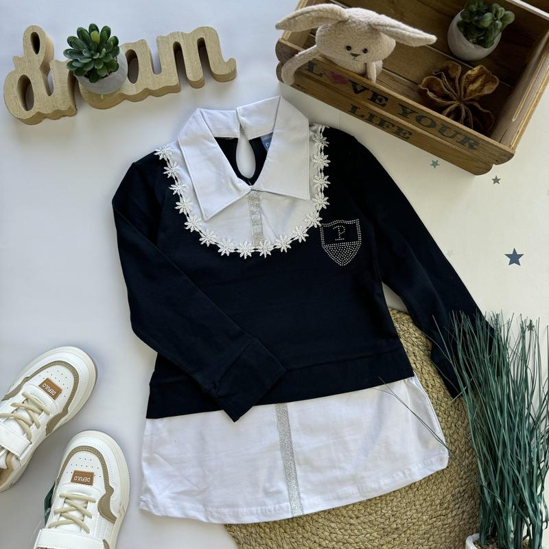 Неймовірно стильна подовжена блуза – обманка! Виробництва Туреччина! Малюнок – каміння. Прикрашена квітами. Застібається на ґудзик. Розміри: 5/6 – рукав 37/ довжина 48 7/8 – 42/ 52 9/10 – 43/ 55 11/12 – 44/ 57 13/14 – 45/ 58 *малюнок – каміння може відрізнятись