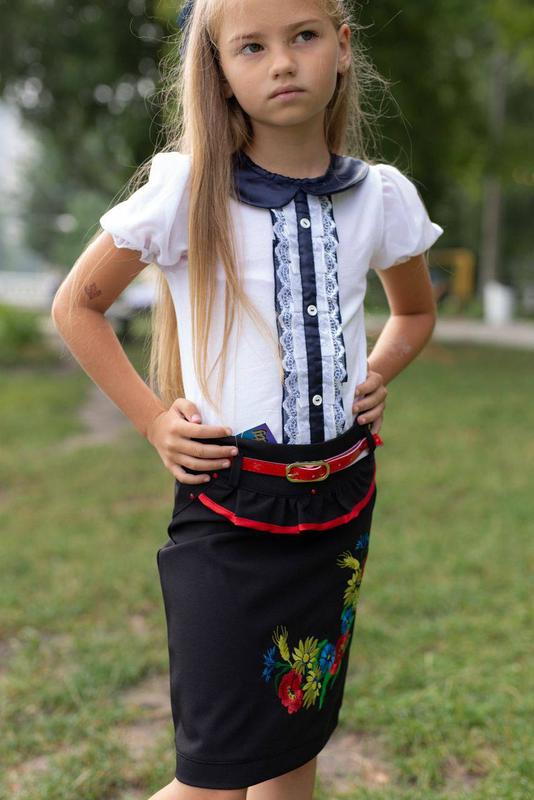 Доставка -Нова Пошта, Укрпошта ‼️‼️‼️ Блуза трикотаж натуральний, оздоблена гіпюром і атласом, гудзики пришиті, рукав на резиночці Розміри 122,128,134,140,146 122- плечі 26, довж 39, 128-плечі 27, довжина 40,; 134- плечі28, довж 41; 140- плечі 29, довж 42, 146- плечі 32, довж 43. Ціна 350грн Спідниці вишиті, тканина Мадона, стрейч, пояс, замок збоку., колір темно синій. Розміри 38,40 42,44,46(8,9,10,11,12 років) 38- пояс 28, довж 42, бедра 32; 40- пояс 30, довж 42, бедра 34; 42 -пояс 32, довж 44, бедра 36; 44- пояс 34, довж 46, бедра 37; 46- пояс 36, довж 48, бедра 39. Ціна 450грн