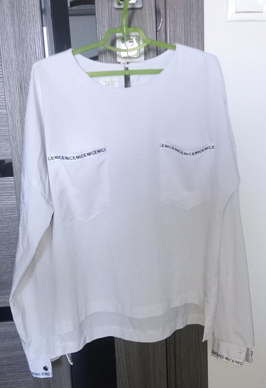Блузка с двумя нашитыми карманами и приспущенными плечами, рост 158 см.Длина 56 см., длина от горловины до конца рукава 67см., длина рукава от шва 42 см.,обхват груди 100 см.