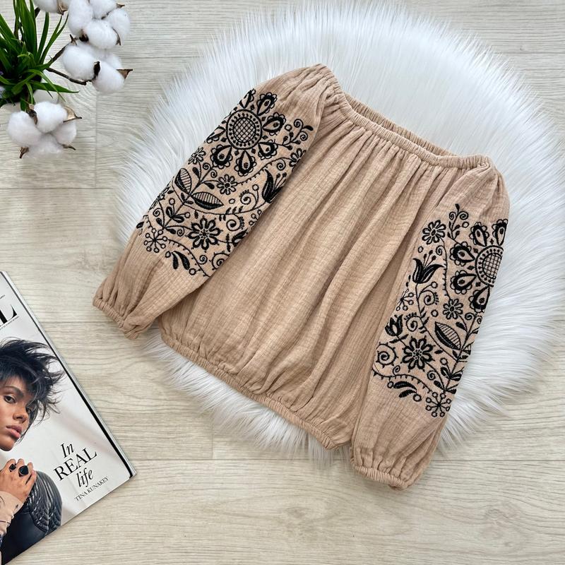 крилова Муслінова блуза в стилі вишиванки 😍🩵💛 Обʼємні рукава🥰 ВИШИВКА 🤩 Легенька дихаюча тканина 💕 Тканина: муслін 🌸 Виробник: Україна 🇺🇦 ЗАМІРИ ⤵ +/- 1-2см!!! 🔸р.134- довжина 41см/ рукав від резинки 40см/ ПОГ 36см. 🔸р.146- довжина 44см/ рукав від резинки 45см/ ПОГ 39см. 🔸р.152- довжина 45см/ рукав від резинки 46см/ ПОГ 41см.
