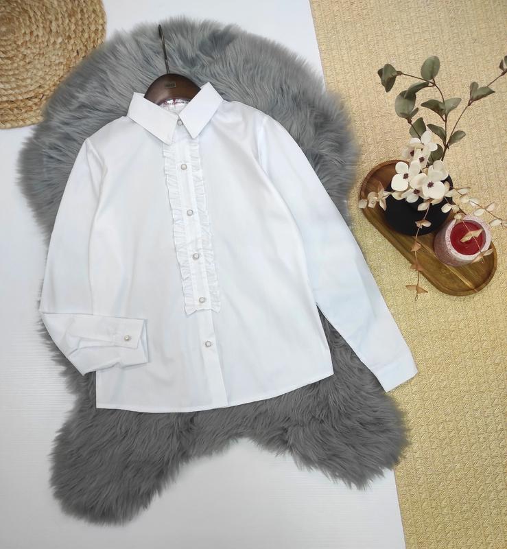🧡В наличии 🧡 Классическая рубашка «Жабо» Распашонка хлопок (стрейч поплин), ткань премиум сегмента Крой классический, полуприлегающий Отложной классический воротник и манжеты Центральная застежка на пуговицах Декор - жабо (снимается), набитые петли, застегиваются на пуговицах по переду рубашки цвет белый замеры: длина/рукав/пог 146-55/54/41 +-2см