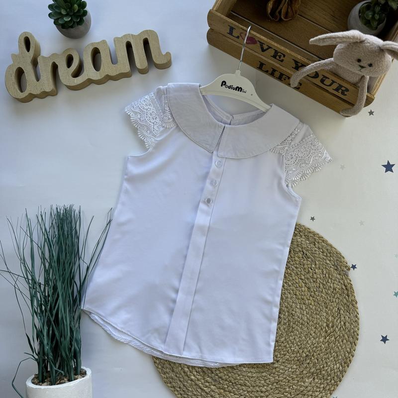 Невероятно стильная, легкая и очень качественная блуза из шифона!Украшла кружевом. Застегивается на пуговицу. Сзади – удлиненная. Размеры: 116 - длина 43 122 – длина 44 128 – длина 46 134 – длина 46 140 – длина 48 146 – длина 48