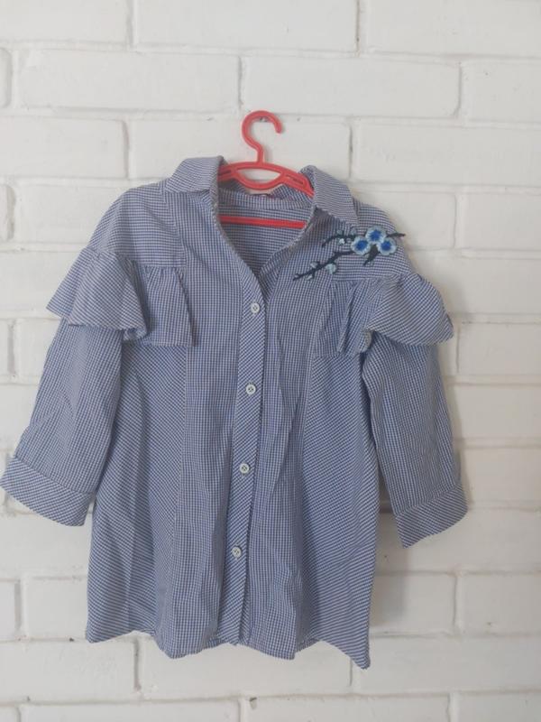 блузка сине-белого цвета в мелких квадратик с цветами на веточке