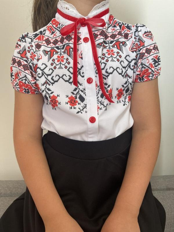 Школьная блузка с! имитацией вышивки. Выглядит очень эффектно. Имеет красивый сетевой воротничок и бархатную ленту. Ткань приятная к телу, не линяет. Хорошо подходит как для повседневная, так и на праздники. Девочким очень нравится эта модель. Размеры полномерные