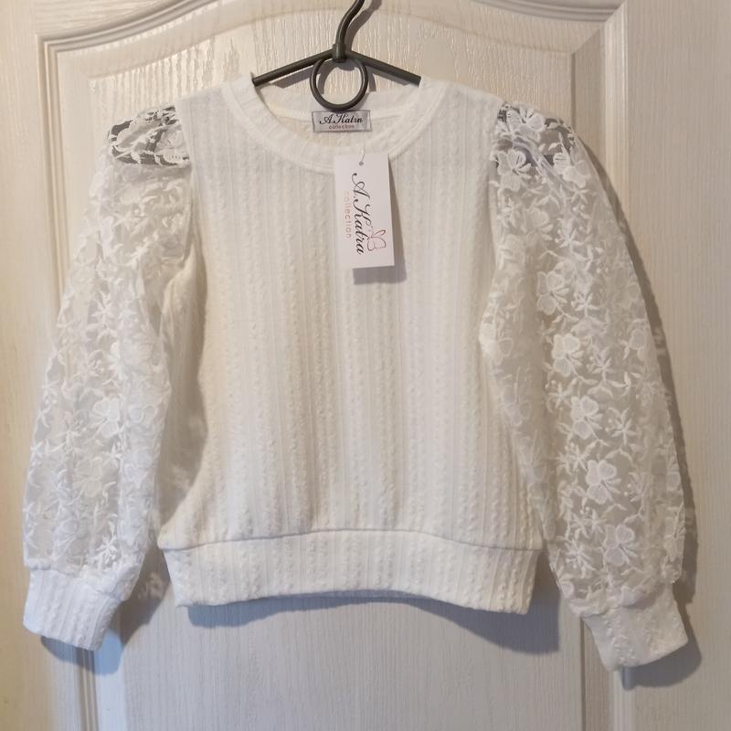 Нарядный свитшот для девочки, размеры: 128,134,140,146 в наличии. Основная ткань-хлопок, рукав из качественного кружева, которое долговечно, отлично стирается. Качество, проверенное годами нашего сотрудничества с этим производителем.
