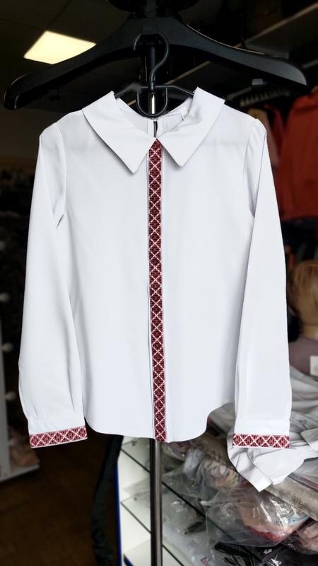 Біла блуза з довгим рукавом та оздоблена вишивкою. Розміри 7-8, 8-9, 9-10 років.