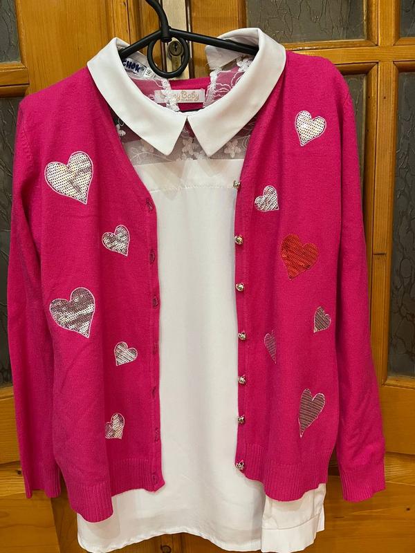 Кофточка на пуговицы..Оздоженная пайетками спереди.Замеры:Рукав-47см.Ог-72см.Довжина кофточки-47см.Ткань тянется.Блуза:Ог-72см,Др-50см.Дв-53см.