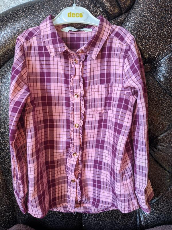 Блузка в клеточку, бордово розового цвета, прошита золотистой ниточкой и зотистыми пуговицами и рюшечками с воротничком. Красивая, стильная, классическая. Зимой можно надевать под гольфик, а в летку можно использовать как накидку под фудболочку. Это наша любимая вещь в гардеробе. Материнская 98%хлопок, 1% металлизированное волокно, 1% полиамид. Размер 110, 4-5роков, ориентируйтесь на замеры.Высота по спине 49 см, ПОГ -34 см., длина рукава 38 см., от плеча до плеча 25 см. По дополнительной информации воспользуйтесь приватом.