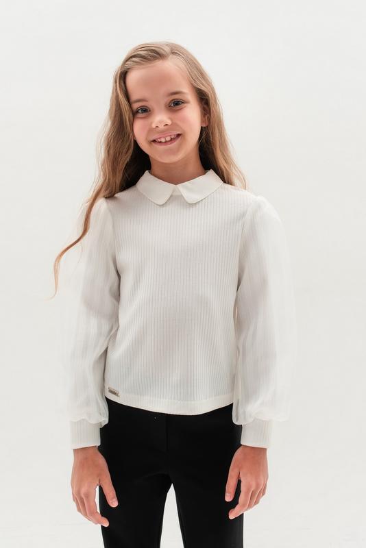 Блуза прямого силуету з довжиною до лінії стегон. Рукав подвійний на манжеті. Горловина оброблена стійкою з софту. Поєднання двох різних тканин додає виробу оригінальності та святкового настрою.