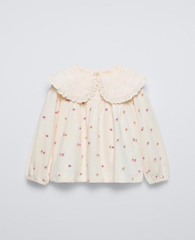 Нежный реглан в цветочек с вышитым воротником. Состав 100% хлопок. Полномерный. Длина 40 см, ширина под рукавами 36, рукав от шеи 45 см. Пересылаю по подписке доставки 100 грн.