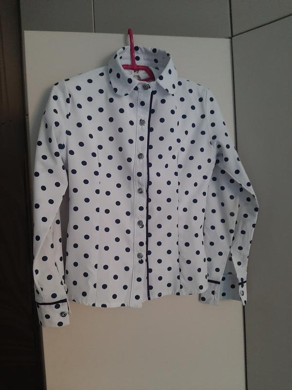 Приятная к телу белая блуза в синий горох.Вик 7-9 летиев. Стрейчева бавовня.Круглий воротник. Расстегивается..На планке -6 серебристых пуговиц. Приталенная.Ширина 34-32-35. Длина блузы-48 Длина рукава-49 (на пуговицах) Плечи-÷30 Синяя оторочка.