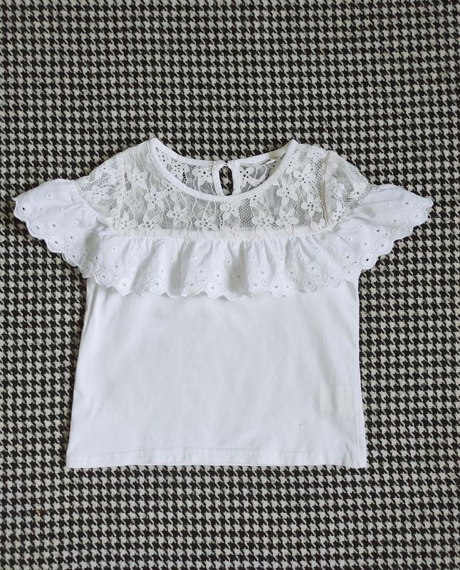 Блузка-футболка,тканина трикотаж(бавовна з еластаном),помірно тягнеться .Мереживо теж трохи тягнеться. Стан ідеальний ПОГ 32,тягнеться до 35-36 Довжина від плеча 37