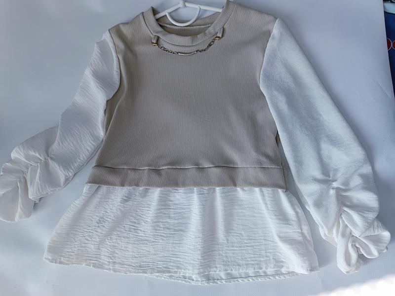 Блузка для девочки Итальянского производства. Ткань рубчик (беж) и муслин (белая). Очень мягкая и приятная на ощупь ткань. В идеальном состоянии. Замеры: длина от плеча 49см, длина рукава от плеча 43см(манжет на резинке) ширина под руками 36 см