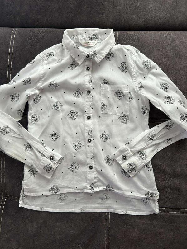 легкая рубашка с милым принтом с котиками станет олюбованной одеждой для вашей дочурки. 7-8р. длина - по спинке 51, перед-46 ширина-36 рукав от плеча с манжетом-50см.