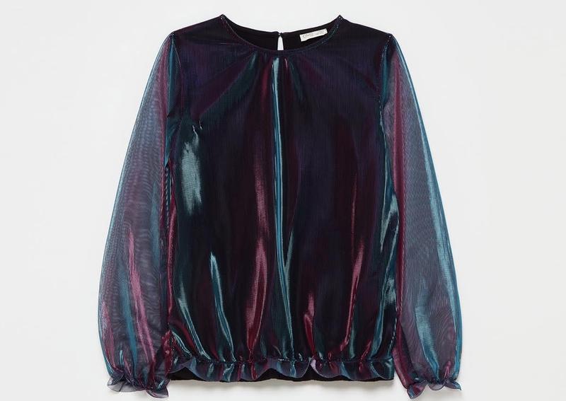 Красивая блуза, которая переливается цветами. Есть несколько затяжек, поэтому цену понижено. Но их можно скрыть.