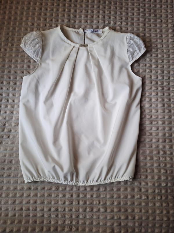 Дуже гарна, зручна блузочка, нічого зайвого, маленька прикраса, кружевні рукавчики, низ на резинці-ідеальне рішення, віскоза, бавовна, полієстер, не світеться, розмір 128. Заміри: довжина 44см., плечі 27см., ПОГ 35см. Стан ідеальний.