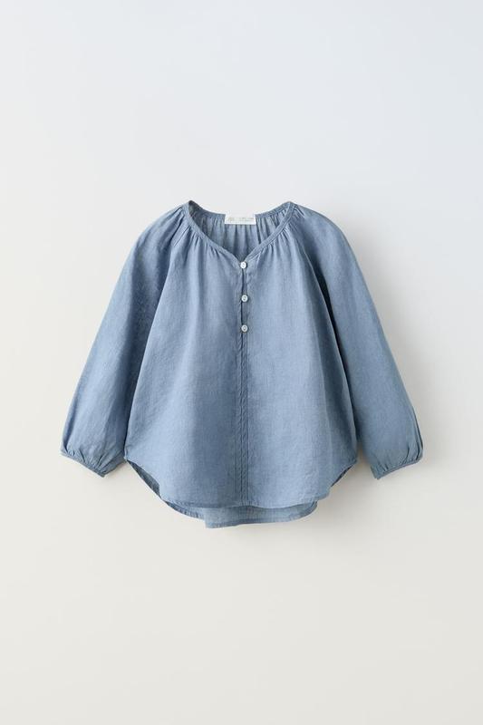 Сіро-синя блуза з 100% льону з нових колекцій від ZARA. Вільний крій, v-образний виріз, рукави-буфи реглан і застібка на гудзики спереду. Заокруглений подол. Стан нової, але без паперової бірки. Розмір 11-12 років 152см Склад : 100% льон Довжина - 62 ПОГ - 51 Рукав від горловини - 61