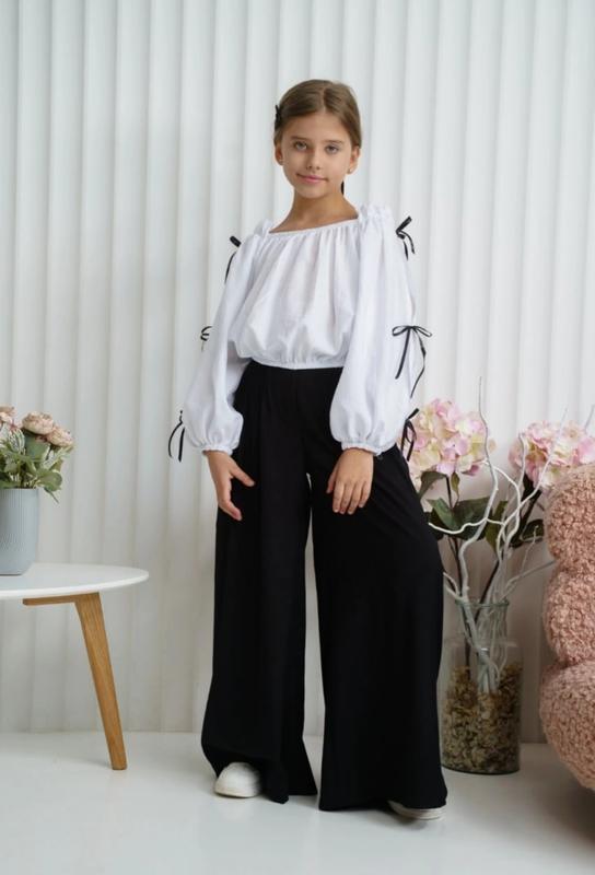 Невероятная блуза, легкая, воздушная, нежная. По длине рукава разрез скреплен бантиками. Снизу собрана под резиночку. Тканина-штапель -жатка. Цвет- белый. Пов Замеры: 140 длина от плеча - 42см, полуобхват груди - 40см, рукав - 49см. 146 длина от плеча - 44см, полуобхват груди - 42см, рукав - 51см. 152 длина от плеча - 46см, полуобхват груди - 44см, рукав- 54см. 158 длина от плеча - 48см, полуобхват груди - 46см, рукав - 57см. 164 длина от плеча - 50см, полуобхват груди - 48см, рукав - 60см.