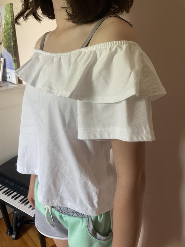 Нова!!! Біла блузочка на дівчинку з воланами, можна одягати на плечі, а можна трішки приспустити. По бірці йде на 158 — 164 розмір, на 13 - 14 років. Заміри: довжина -44 см ПОГ-40 см