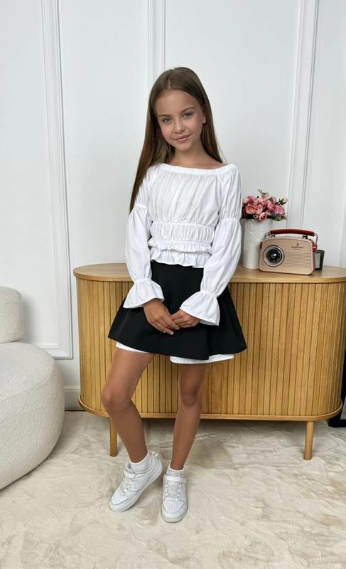через кнопку купить только полная оплата!!! Красивая блуза белого цвета✨ Ткань: Супер софт хорошего качества Блузу можно носить на плечах и на руках замеры-длина\пог\рукав от горловины 140-40\34\52 146-42\37\54 158-47\42\57 164-46\45\59 Ток