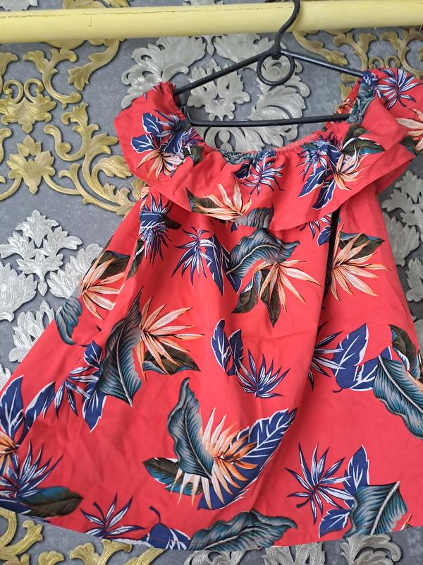 Цена 129 грн лузка с открытыми плечами,фирмы Primark Цвет основы - насыщенно-красный Принт - тропические крупные листья в сине-зеленых, белых, оранжевых и бежевых оттенках, создающих экзотическое, летнее настроение; Фасон – свободного кроя, обеспечивающего комфорт и воздухопроницаемость; Верхняя часть - с широкой резинкой и декоративным воланом, предназначена для ношения "офф-шолдер" (открытые плечи); Материал выглядит легким, предположительно хлопок или вискоза - идеально для жаркой погоды. Блуза - отличный вариант для отпуска, пляжной прогулки или летней вечеринки. Якорь, обухала и добавляет образу тропического настроения. Хорошо сочетается с шортами, джинсами или юбками в нейтральных тонах.