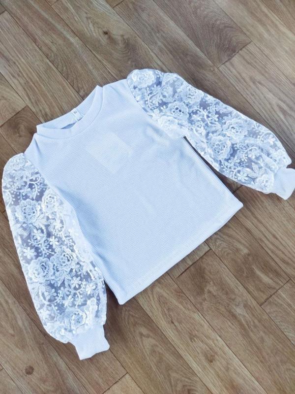 Нарядная кофточка для девочек. Тканина: трикотаж рубчик + мереживо. Цвет - белый. Цена: 655 грн. Замеры: 122 длина - 36см, полуобхват груди - 30см, рукав от плеча - 42см. 128 длина - 37см, полуобхват груди - 31см, рукав от плеча - 44см. 134 длина - 39см, полуобхват груди - 32см, рукав от плеча - 48см. 140 длина - 41см, полуобхват груди - 34см, рукав от плеча - 50см. 146 длина - 43см, полуобхват груди - 36см, рукав от плеча - 52см. ▪️N-4T