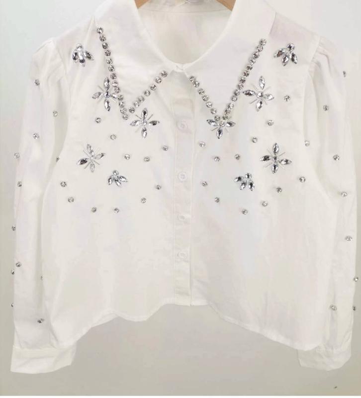 Необычайно красивая и нежная блузка😍, Французский бренд качественный и стильный, все стразы надежно прикреплены, ткань коттон Цена - 865 грн Код 106/1 Размеры: 4р - 2шт 6р - 2шт 10р - 2шт 12р - 2шт 14р - 2шт Замеры: 4 - длина 35см, рукав 39см 6 - длина 41см, рукав 48см 8 - длина 43см, рукав 50см 10 - длина 44см, рукав 53см 12 - длина 47см, рукав 54см 14 - длина 49см, рукав 57см