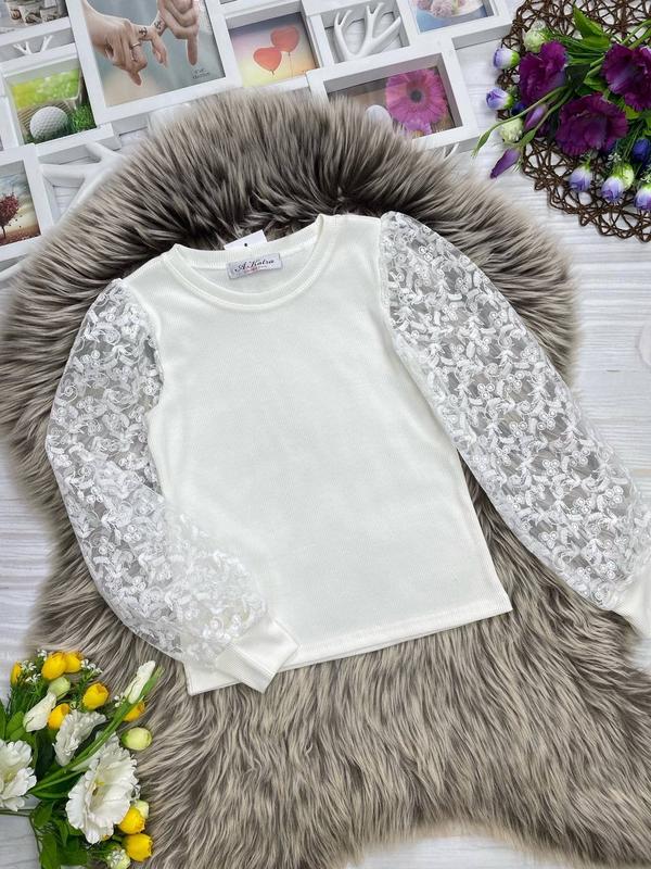Інст babystore__clothing Ніжна кофтинка з мереживними рукавами тканина рубчик + мереживо на сітці Заміри: довжина кофти/пог/рукава від плеча 134 - 41/31/49 140 - 44/32/52 146 - 46/33/56
