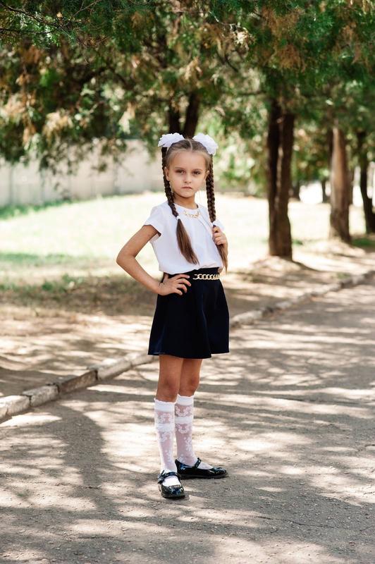 Дуже ніжна та красива блуза для дівчинки. Ззаду застібається на гудзик. Спереду гарний ланцюжок. Одягали двічі (1-2 вересня, після сильно похолодало). Без недоліків. Повний образ можна побачити на останньому фото. Щоб так само зібрати дивіться мої інші оголошення. Заміри блузки: довжина-45 плечі-27 пів обхват грудей-36 пояс-35