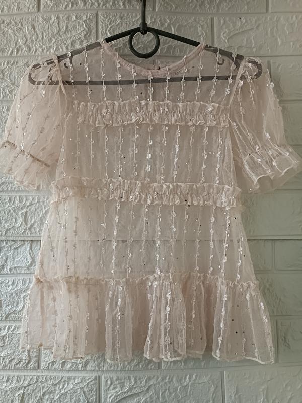 очень красивая блузина девочку прозрачная, длина 50, полуобхват груди 38+ хорошо тянется, плечи 2 9, рукав 21.