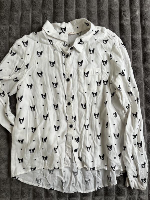 Блузка для дівчинки від бренду H&M з принтом бульдога дуже стильно виглядає. Заміри: Довжина - 46 см. Довжина спина - 54 см. Ширина - 42 см. Рукав від плеча - 49 см.