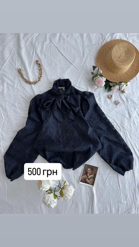 Темно-синя обʼємна блуза у вибиті квіти, у складі є поліестер Розмір L Одягалась 1 раз на фотосесію