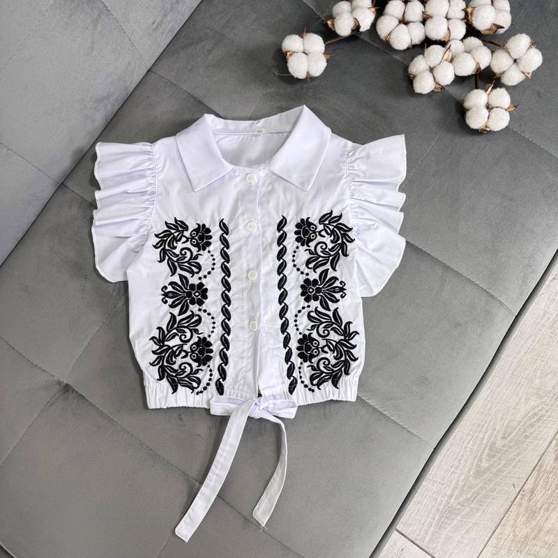 Тканина бавовна. Малюнок машинна вишивка. Застібається на гудзиках, по низу йде резиночка, спереду зав'язується. На рукавах волани. Розміри 110-128