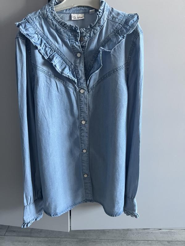 👗 Джинсова блузка-сорочка Blukids Стильна та зручна річ для щоденного образу! 💙 Виготовлена з легкої джинсової тканини, має романтичні волани на грудях і комірці, що додають ніжності 🌸 🔹 Деталі: • Колір: світло-блакитний 💎 • Застібка на кнопки 🤍 • Довгий рукав з манжетами • Легка, комфортна та дихає – ідеальна як для школи, так і для прогулянки 🌿 📏 Розміри: • Довжина: 59 см • Плечі: 33 см • Груди: 39 см • Рукав: 54 см 👍 Стан: відмінний 🌸 Ідеально поєднується з джинсами, спідницею чи шортами.