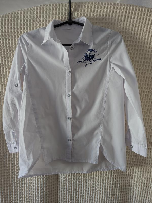 хорошая школьная блузка состояние на 4 из 5-ти эффектов нет, просто видно что носили размер указан 152,мы одевали где-то до 150,11 лет, потому что дальше стал коротковатый рукав длина-сзади -62,спереди 54 ширина-45,рукав от плечевого шва-41