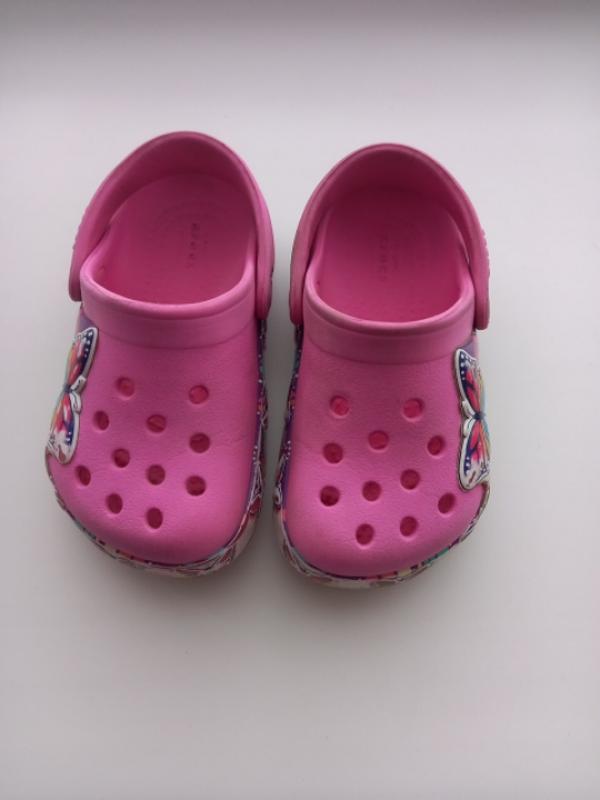 наши любимые розовые кроксы с бабочкой, оригинал, с 6, состояние передала на фото, рисунок кое -где стерся, а так всё отлично