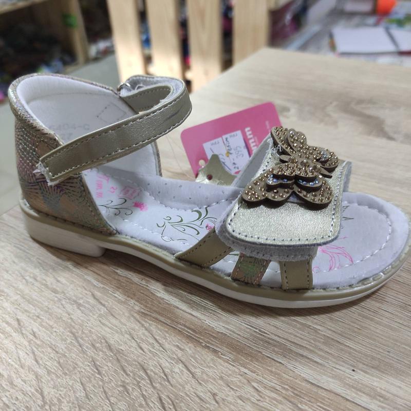 Золотистые босоножки для девочек с бабочками! В модели: ✔️ гибкая подошва с небольшим каблуком ✔️ внешне натуральная кожа+эко-кожа ✔️ кожаная стелька с супинатором ✔️ плотная пяточка ✔️ практичные липучки для надежной фиксации стопы ✔️ универсальный цвет под любую одежду Размер по данной модели: РАЗМЕР Длинна стельки 27 17,5 см