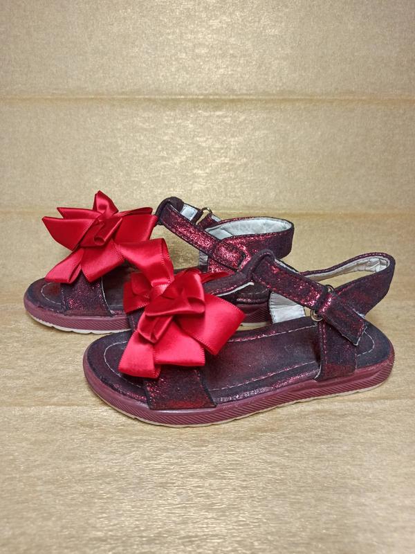 Очень красивые босоножки. Стелька от края до края 17см, подойдут на 16см. Внутри кожа. Цвет темно - красный с блеском. Застежка - липучка.