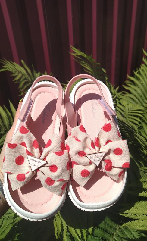 Силиконовые босоножки с текстильным бантом. Крепятся с помощью липучки. Длина внутренней стельки - 18 см.